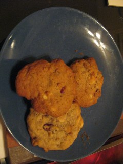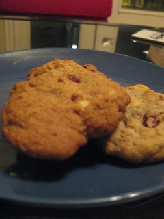 Another day, another recipe. This one is from last weekend — I decided I needed a new type of cookie, and I remembered the ones I had in California, they amazing cranberry, oatmeal, white chocolate cookies with pecans in them…so I went on a quest to find the recipe. Let me tell you something — it’s amazing how many different recipes people have for cranberry cookies out there! Anyways…I ended up finding them after much searching (when I probably should have been lesson planning…but that’s neither here nor there), and found out they’re called…Cranberry Hootycreeks — I’m not even kidding. I tried to figure out what a hootycreek actually was to no avail…but I gave up when the cookies were done, because well — they were too tasty to leave just sitting there. I actually snarled at Tyler when he tried to eat one…anyways! Below is the recipe.