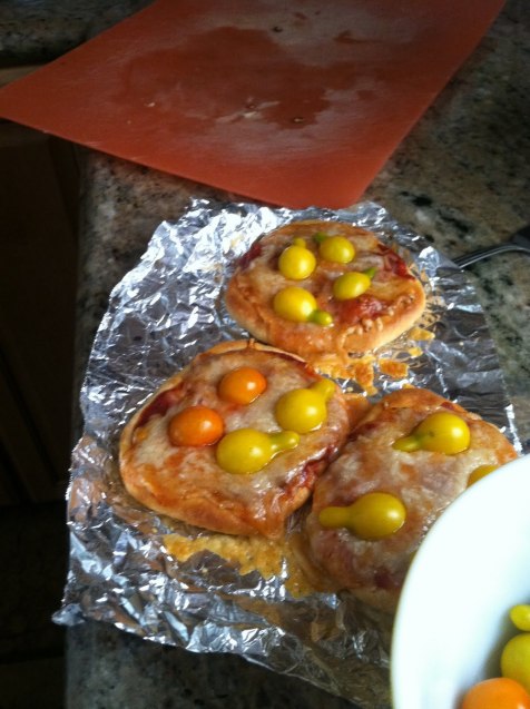 2 thoughts on “Tomatoes from the garden, mini-pizzas, and a mango smoothie
