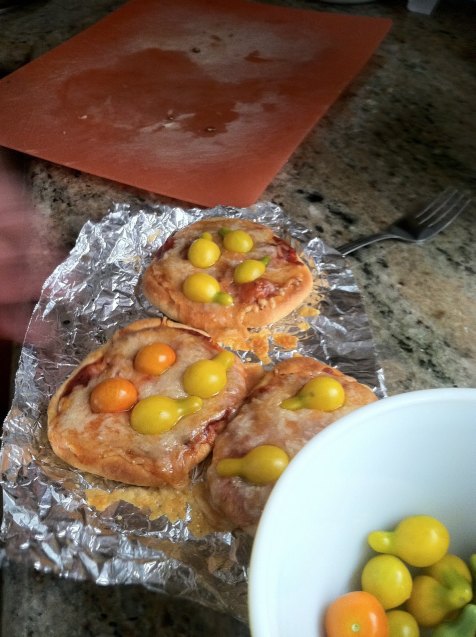 Tomatoes from the garden, mini-pizzas, and a mango smoothie