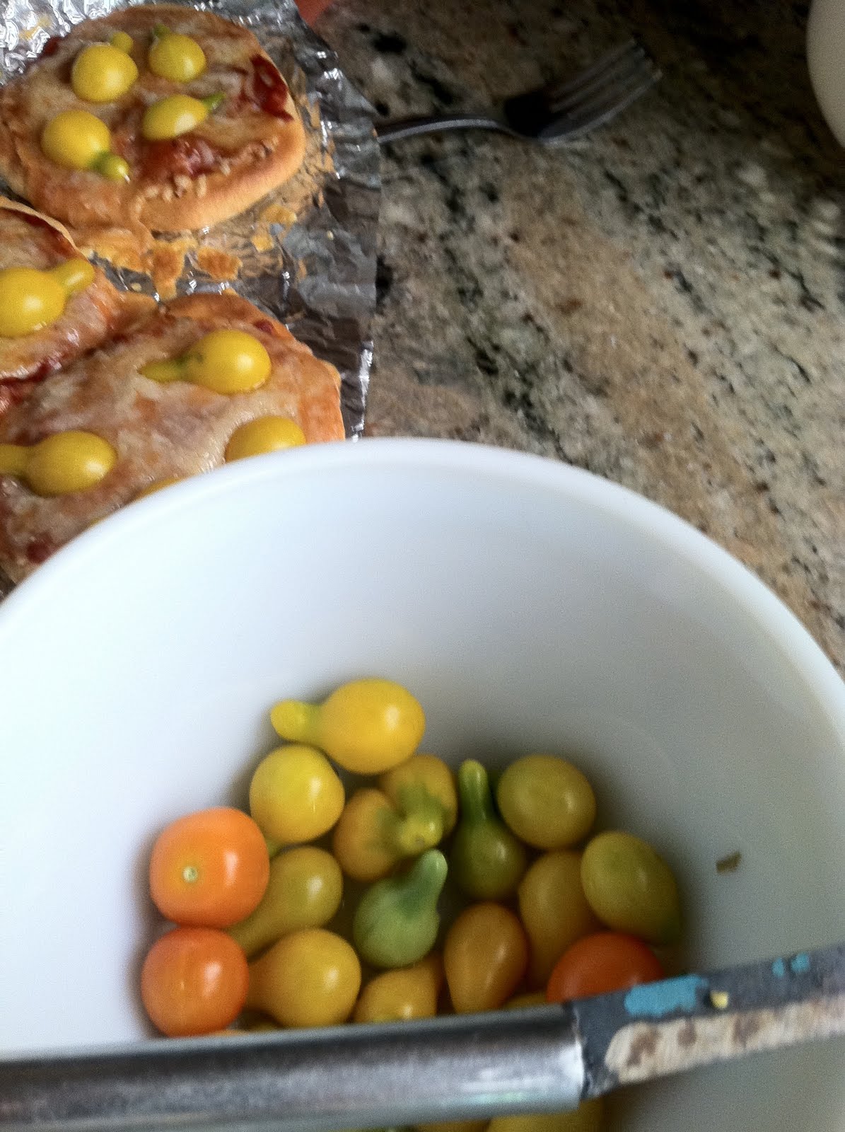 Tomatoes from the garden, mini-pizzas, and a mango smoothie