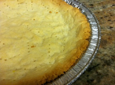 Press it into a tart tin or a pie tin, I did it in a pie tin, so it’ll work either way. Then prick it all over with a fork. This is to prevent the formation of bubbles. Refrigerate it for a minimum of 20 minutes, and then toss it into the oven for 15 minutes, and it should turn golden brown. Pull it out and let it cool.