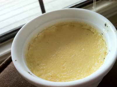 Now comes the fun part….when you want to burn the sugar on top, take a tsp. of the vanilla sugar you made, put it on the custard, spread it around, and either stick it in your broiler on high for a minute or so, or if you have a handle held flamer, just flame it!