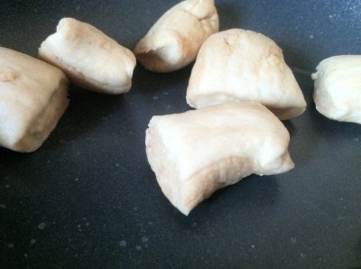 Then preheat the oven to 425, and split the dough into 8 different parts. Roll each part into 14 inch ropes, and cut it into 1 inch pieces.