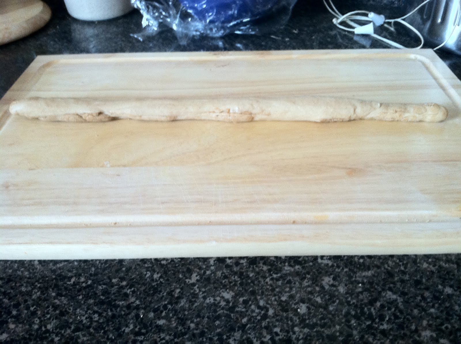 Then preheat the oven to 425, and split the dough into 8 different parts. Roll each part into 14 inch ropes, and cut it into 1 inch pieces.