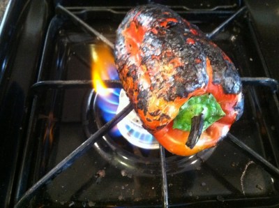 Anyways, turn the stove on high, and place the red pepper directly on top of the flame. You might hear some crackles and pops, but that’s okay, that’s just the water sublimating. Keep it on the stove until the skin of the red pepper is nice and charred all over. Don’t get worried if it’s taking a while, that’s normal.