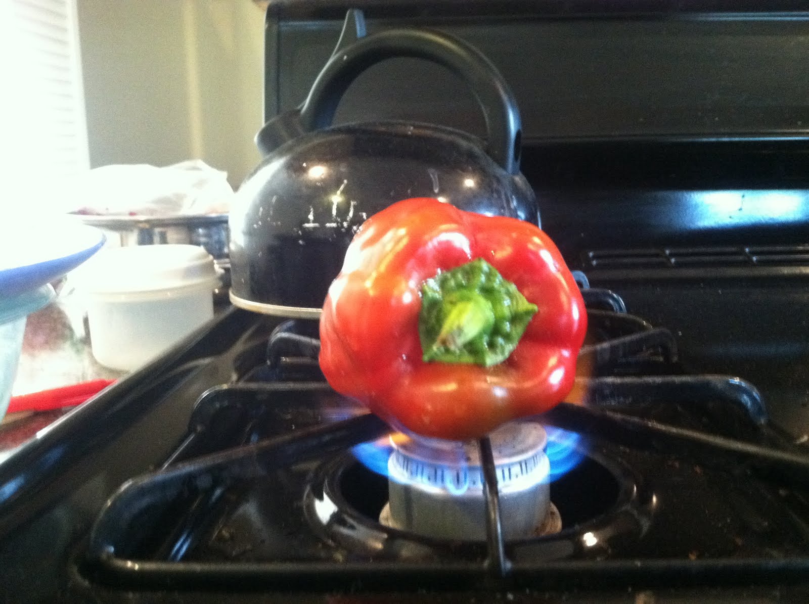 This is surprisingly easy, all you need is a gas stove. Buy some red peppers (large) from the store, preferably ones with stems, since it’ll be easier. Wash them, make sure that they don’t have any stickers on them.