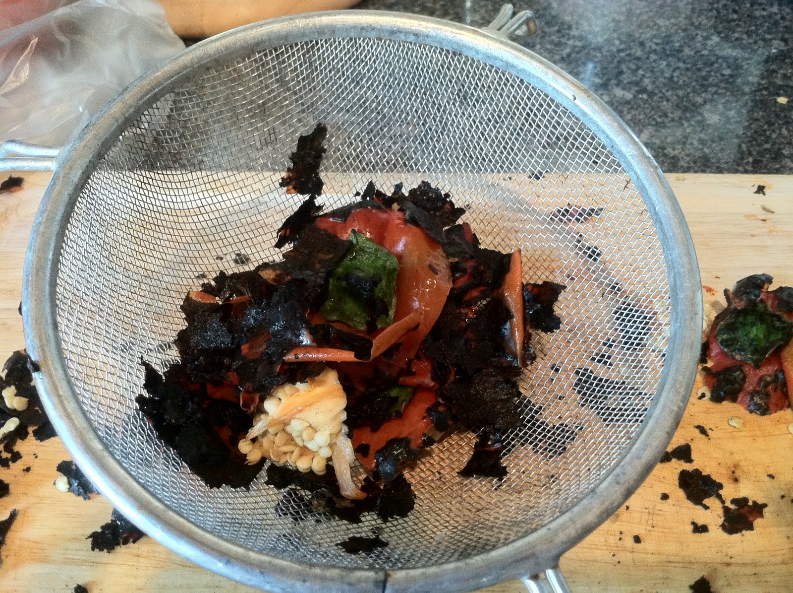 As soon as the entire thing is charred, place it in the bowl, and cover it. IMPORTANT: don’t open the cover except to put in another pepper. The steam needs to stay trapped.