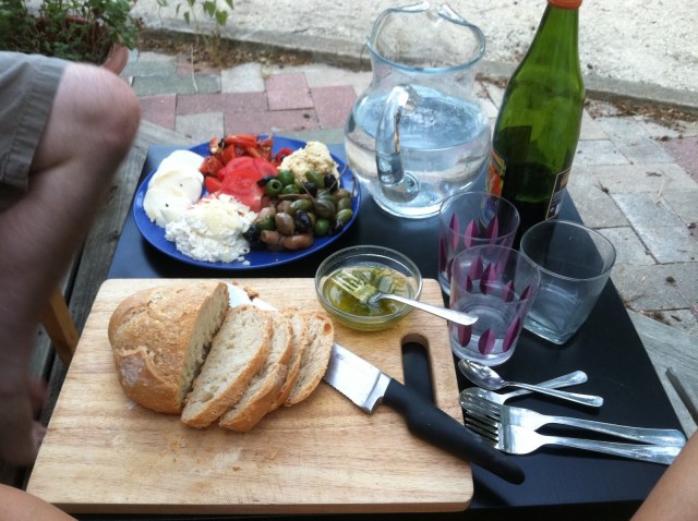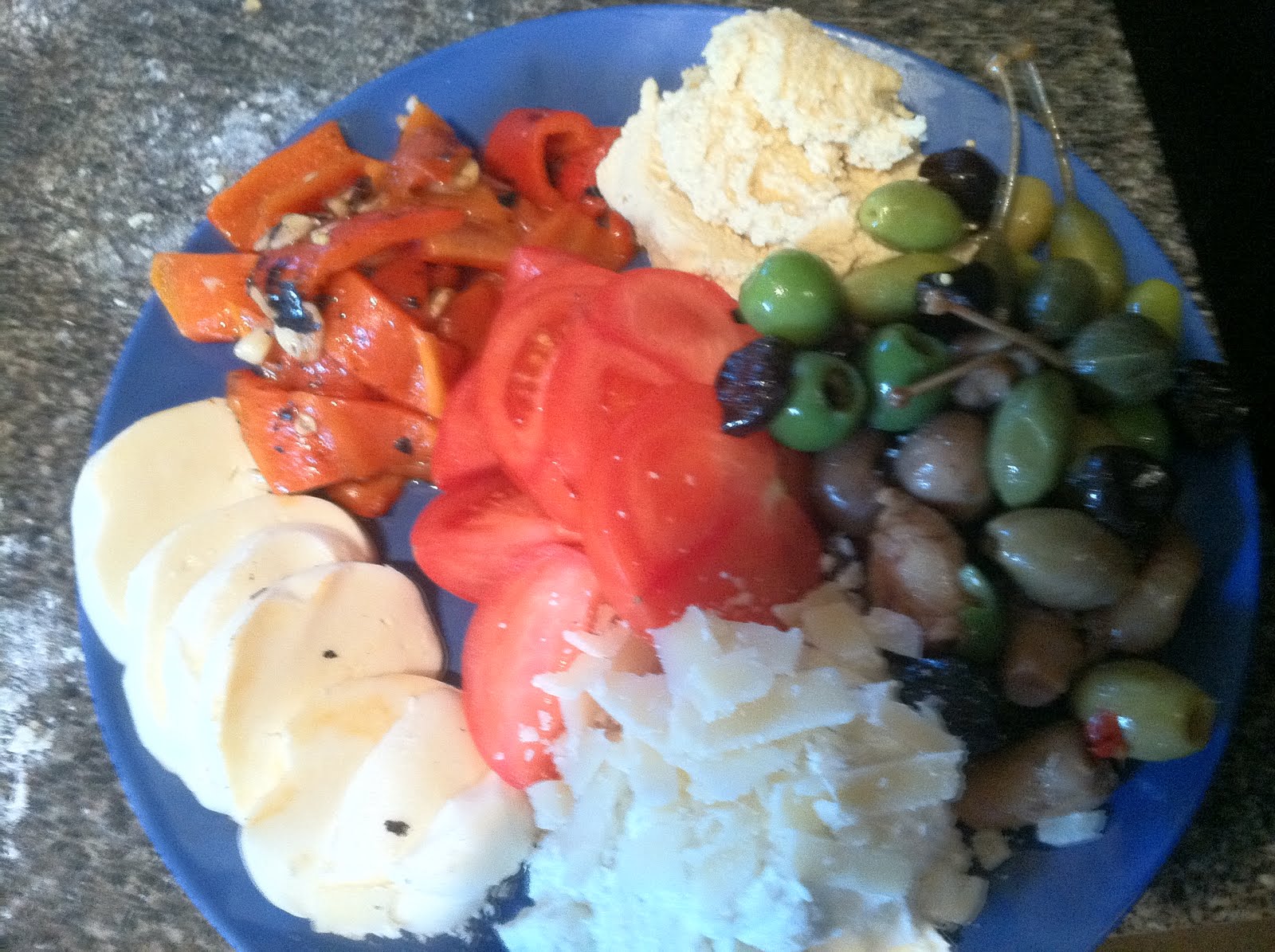 It had peppered goat cheese, home roasted red peppers in a garlic marinade, homemade hummus, fresh mozzarella, tomatoes, and assorted olives. I served it with warm bread and olive oil.