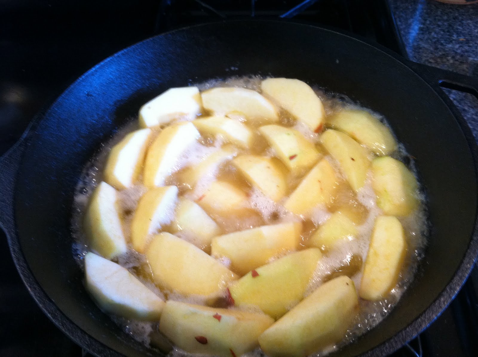 Then heat the whole sha-bang on medium-high heat for about 10 minutes. The sugar will caramelize and the apples will cook. After about 10 minutes, the apples will have gotten smaller, so any left over apples can be smooshed in there. Cook for another 5 min.