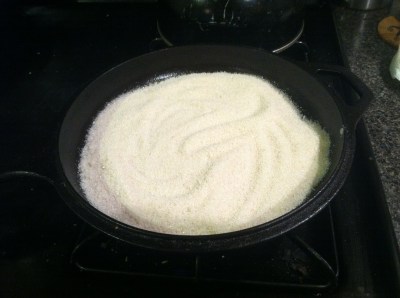 In a heavy, metal saucepan or a dutch oven, or a cast iron saucepan, spread all the sugar evenly over the bottom and heat it over medium heat.