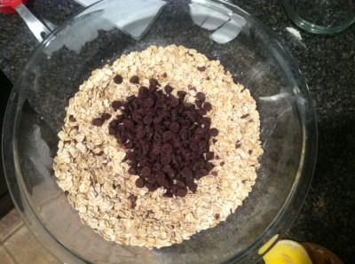 Then combine the oats, chocolate, and cocoa nibs in a bowl. Remove the stand-mixer bowl from the stand, and then using a spatula incorporate the oats-mixtures until it’s all well mixed and there are no more extra bits of flour.