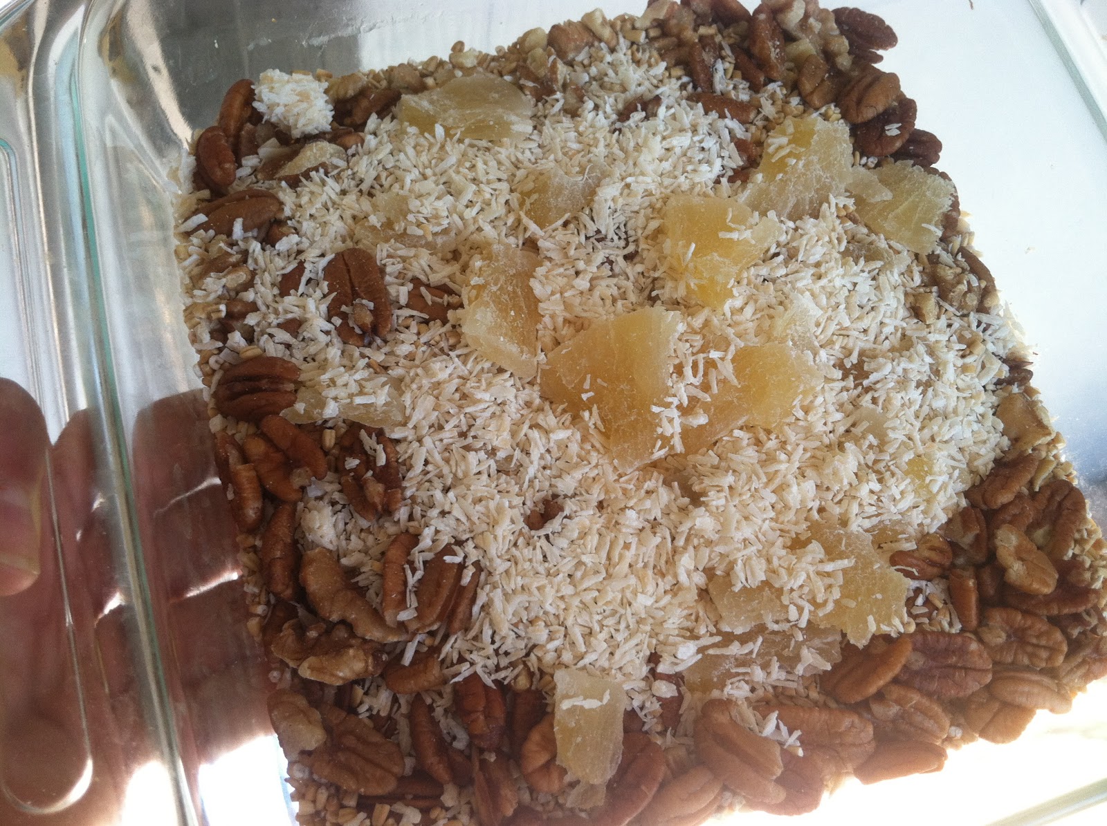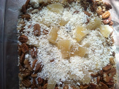 I’ve made tons of variations on this, but Pecan Pina Colada is latest creation, and I like it! So I figured I’d share. They are pretty malleable, so you can change the amount of the ingredients depending on what you like (sour cherries fan? Sure, toss ’em in! Hate coconut? Omit it!)