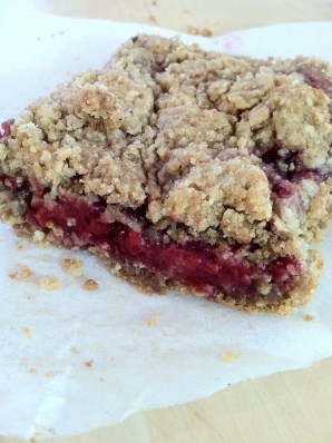 These bars are are layered…you get the initial granola-brown sugar situation, then a burst of tart raspberries, then finished off with another layer of rolled oat goodness. Super simple, quite tasty, and healthful!