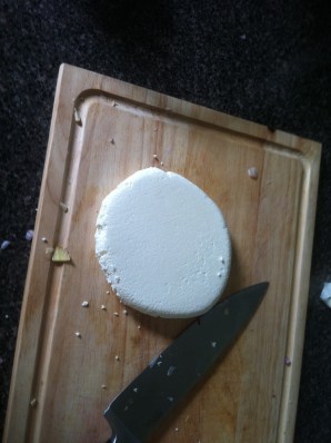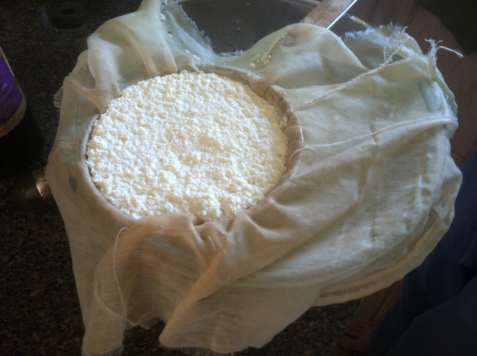 Once you pour it all through, lift the cheese cloth off the strainer, and twist it so the cheese in a ball, covered in cheese cloth (be careful, it’ll be quite hot). Then just rinse the ball under cold water, to wash off any remaining lemon taste, and squeeze out any excess water. Place the whole thing under a heavy pot on a plate, and allow it to sit for about an hour to squeeze out the water.