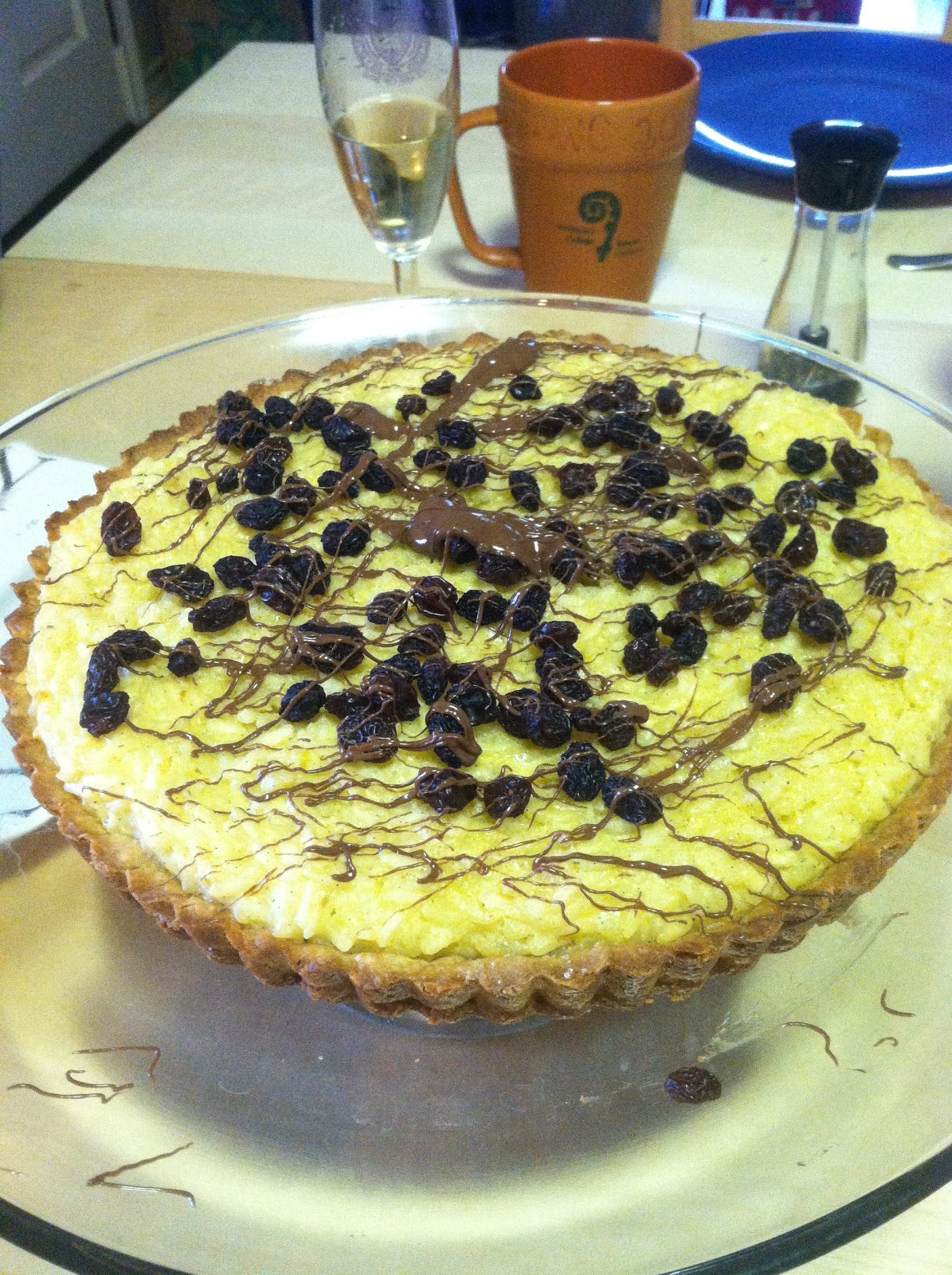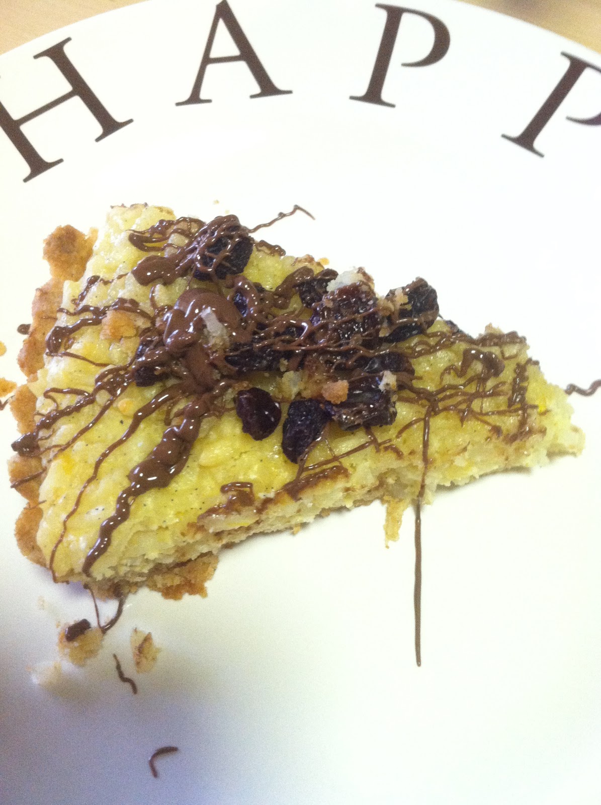 Allow it to cool when it comes out, I topped it with raisins and and but of warmed up nutella. You can top it with any kind of dried fruit, and something tart–perhaps a jam that you’ve warmed up? Maybe some lemon curd? Let your imagination work! 🙂