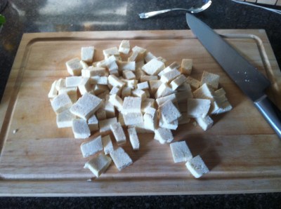 Cut up the tofu into cubes, and saute them in some olive oil until they are lightly brown on either side.