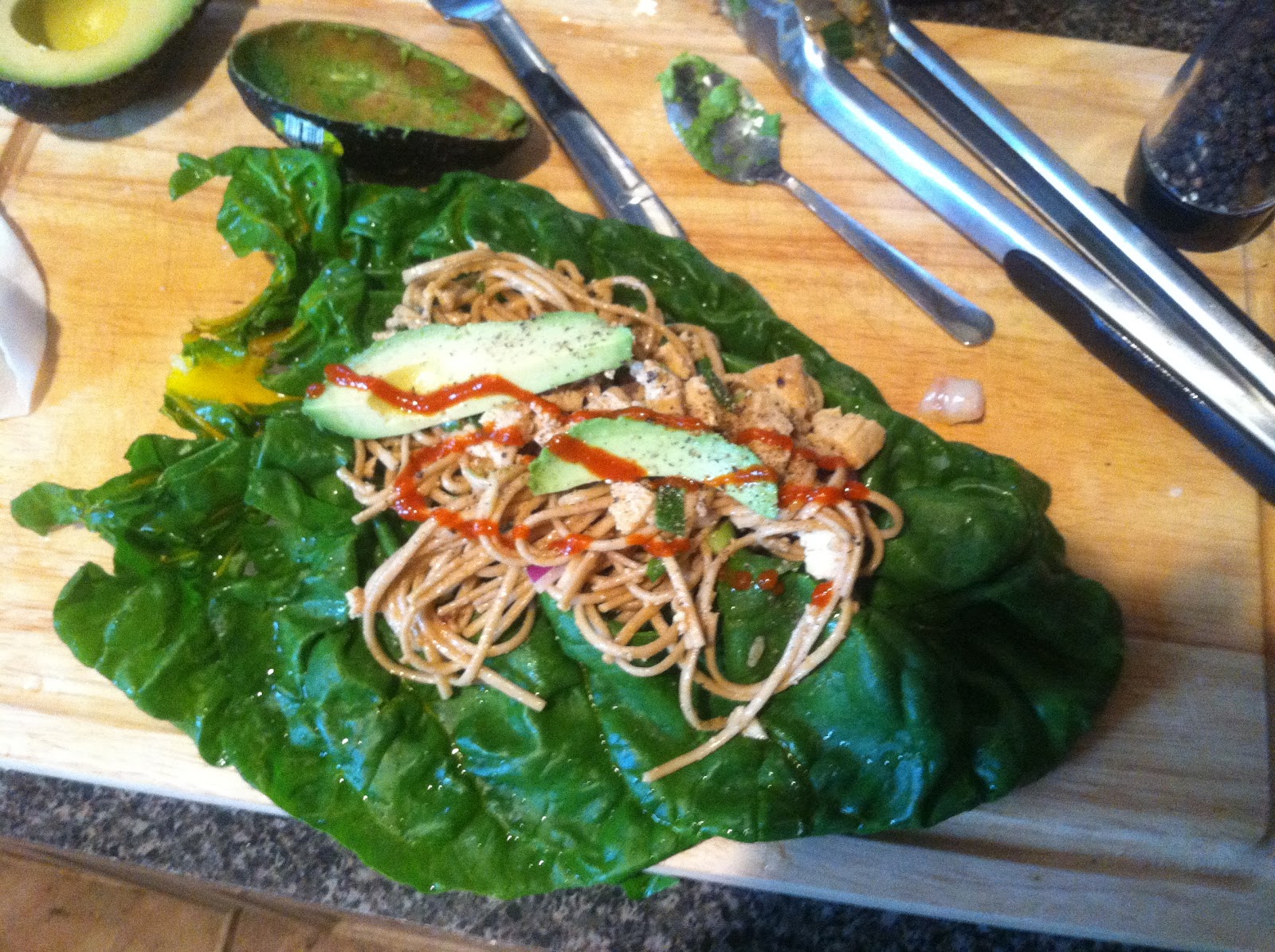 When everything is done, lay out a chard leave, fill the middle with a bit of the noodles, put a few slices of avocado, or some walnuts or pumpkin seeds in the middle, a splash of hot sauce, and roll it up like a burrito. Enjoy!