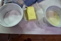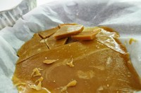 Caramel — get your ingredients together, and a medium sautepan. Put the sugar in by itself and turn the heat to medium. Mix the sugar around with a wooden or metal spatula and you’ll see it begin to melt. When it’s melted entirely, take it off the heat, and stir in the butter. It’ll start to bubble, but that’s okay, just keep stirring. Then add in the salt, and heavy cream, and put it back on the burner over medium-low heat. When it turns a golden brown color, you’re done. Pour it into a pan lined with non-stick sprayed parchment paper and stick it in the freezer for 45 minutes. When it’s done, you can shatter/cut it.
