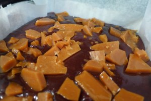 Brownie batter — Preheat your oven to 350. melt the chocolate and butter over a double boiler. When it’s melted and stirred together, add the sugar and mix well. Then add the 2 eggs, vanilla, salt and mix together. Then add the flour about 1-2 tbsp at a time, mixing to make sure it incorporated. Then you take about 1/2 the caramel pieces and mix it into the batter. Pour the batter into a non-stick sprayed pan. Put the rest of the caramel pieces on top. Pop it in the oven for about 25-30 minutes, pull it out, let it cool, and you’re done!