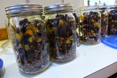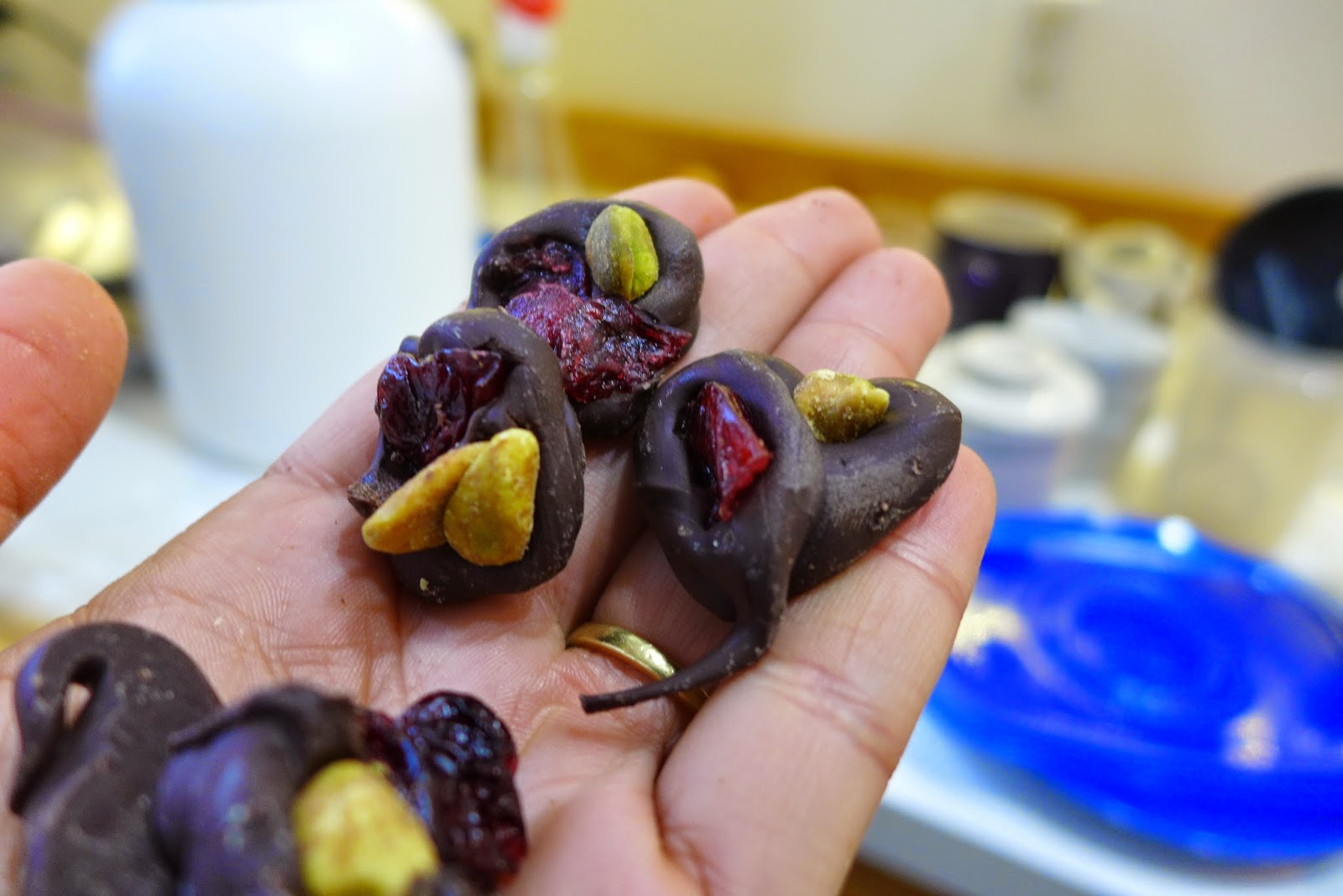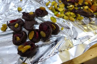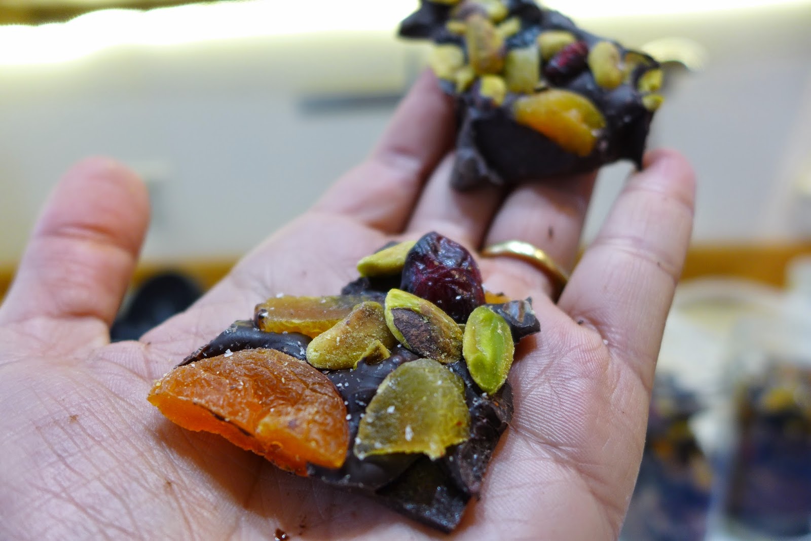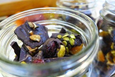Lay out a large piece of baking sheet paper. Melt your chocolate. Use a spatula to put it inside a plastic bag. This is a messy, messy process. That’s okay — don’t wear your nicest whites is my only advice. Cut the tip of the bag off, and squeeze out dollops of chocolate onto the baking sheet. As soon as you’re done, place one dried fruit and nut in the center. Do this quickly, the chocolate dries fast. Then salt it. And you’re done. Let it dry and enjoy.