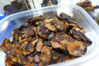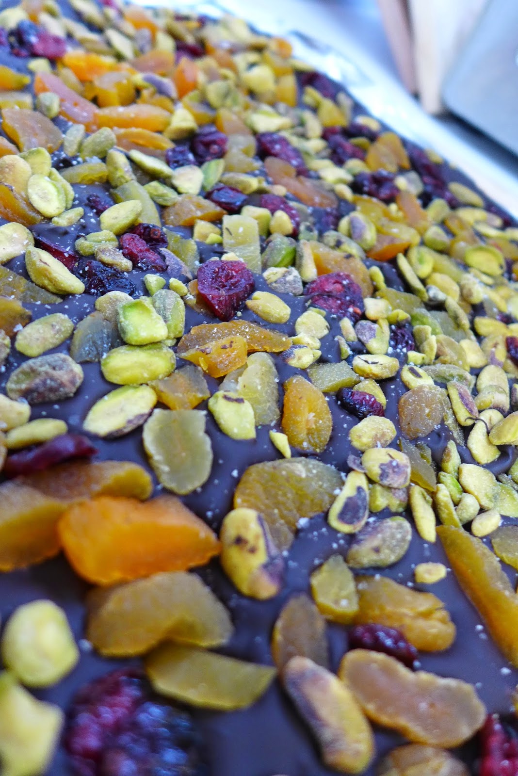 Spread that over your 9×13 pan. Sprinkle the dried fruit on it, and push it down so it sticks in the chocolate. Then add the pistachios and push down. Then sprinkle the salt on top. Put it in the freezer for 20 minutes, and break it up, and you have bark!