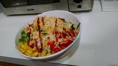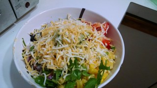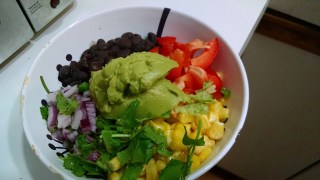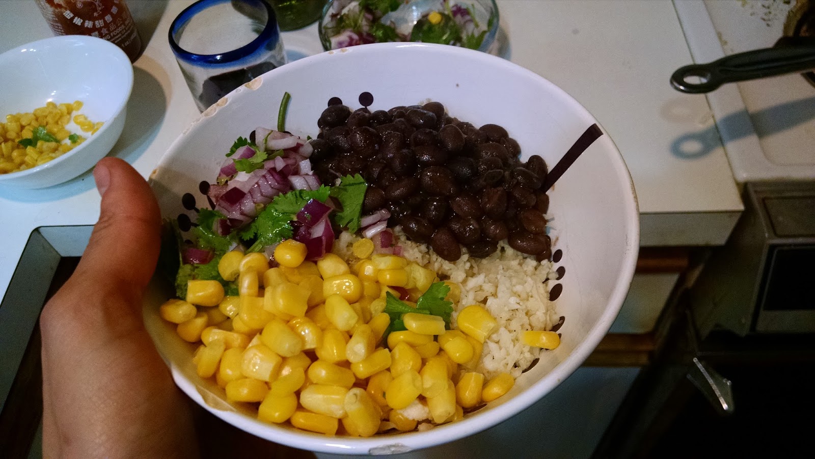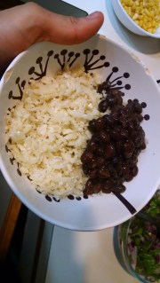 And this worked. The “rice” has no real flavor…so it’s takes up the taste of whatever you season it with, in my case a little garlic, salt, pepper, and lime juice. It acts as a medium over which you can layer other flavors, beans, guacamole, salsa, corn, cilantro, red pepper, etc. and is healthier than rice.