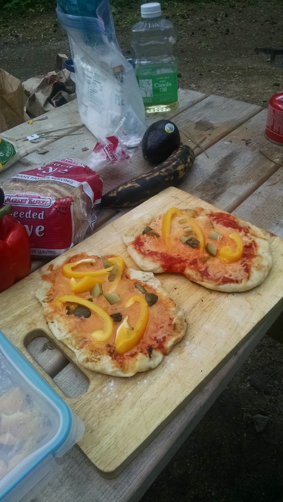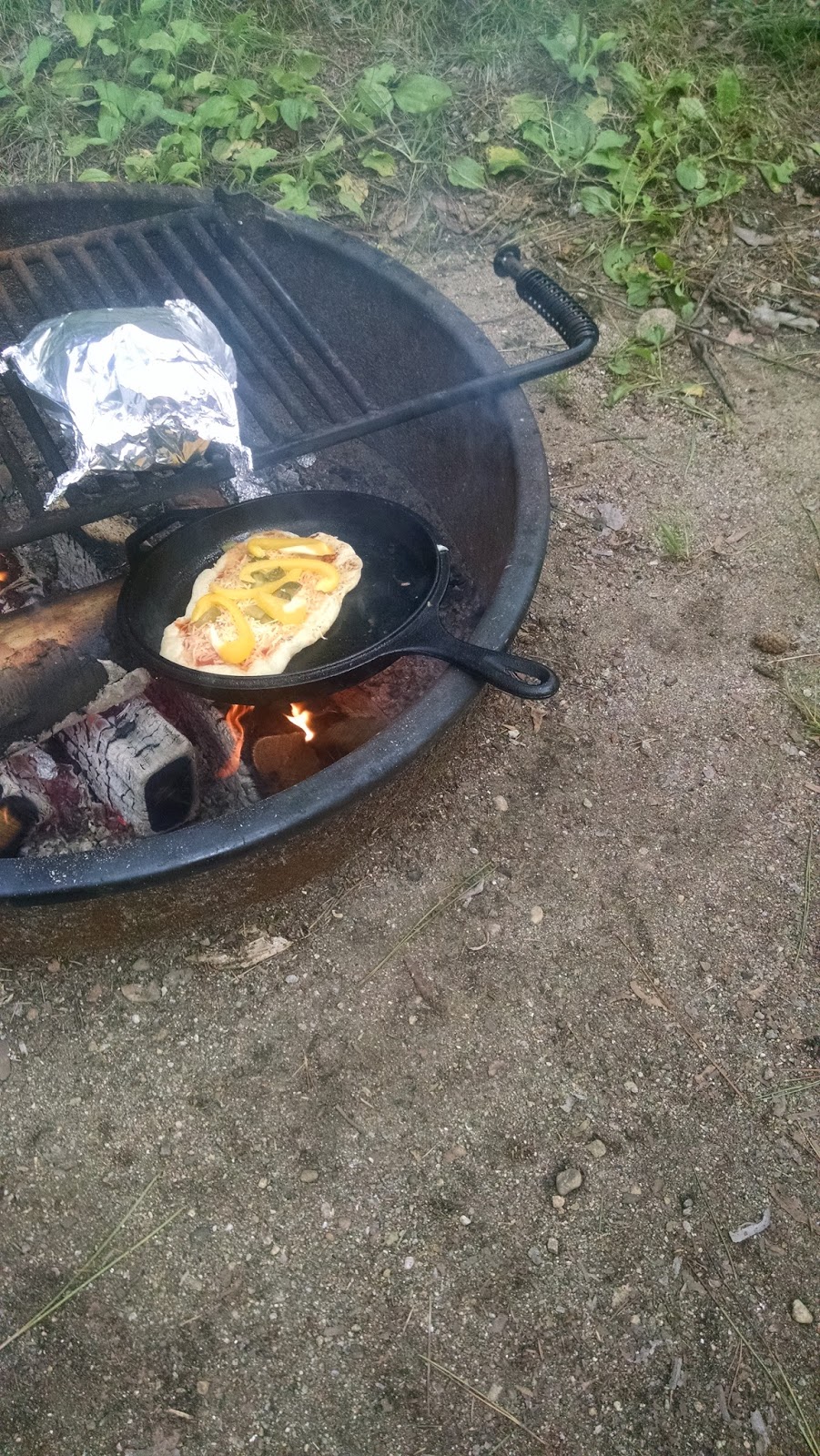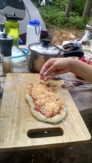 Then the piece de resistance, pizza. We made campfire pizza. Easy, peasy, lemon squeezy. Trader Joes pre-made pizza dough, arriabata sauce, some peppers, some pickles (we had leftover pickles so I thought, why not?!) and some cheese. Man alive was that pizza good.