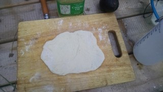 For the pizza dough, we floured it, and then cut it into four parts, so that our pizzas would be small and thin, and we rolled them out as thin as we could.