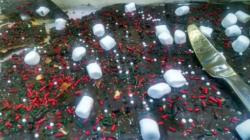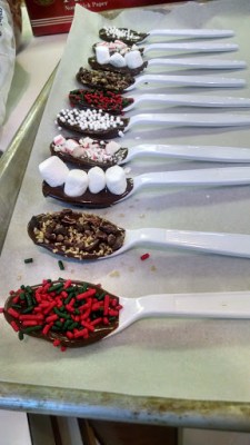 What you need: Plastic spoons, bittersweet or semi-sweet chocolate (8-16 oz), toppings (marshmallow, sprinkles, cocoa nibs, peppermint pieces, more chocolate, toffee, etc.)