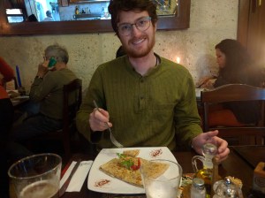 Day 9: Went to Mirador Yanahuara. Went to the store to buy cortauñas for Tyler (nail clippers), got some bread and cheese for lunch and had lunch at the Mirador in Yanahuara. Went home for a siesta, went to Chaqchoa for beer and chocolate and met a fantastic french couple there. Went to Santa Catalina Monastery with them which was incredible, a city within a city, and then Crepisimo for dinner.