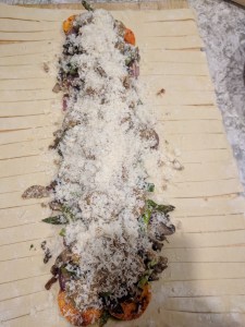 how. Essentially, on the remaining thirds of the puff, you cut about 2 inch strips, and then braid the strips over the filling. When the braiding is done, brush the butter/garlic mixture on the outside, transfer it to the baking sheet gently and bake for 20-25 minutes until the top is golden brown.
