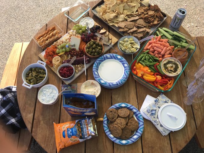 Then of course to accompany it, we had a veggie plate with a variety of dips (hummus, caramelized onion dip, roasted eggplant dip, and tzatziki), and then chips and crackers a plenty!